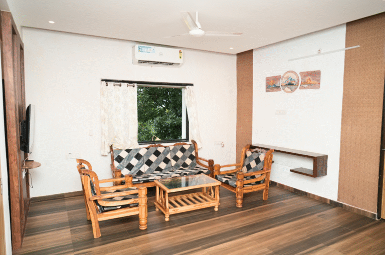 What sets our villas apart is the attention to comfort and privacy. You’ll enjoy the freedom to unwind in your own space while still having access to all the resort’s amenities, including the swimming pool, gardens, play zones, and in-house vegetarian restaurant. For guests who prefer personalized experiences, we also offer room service, bonfire arrangements, and rain dance setups.